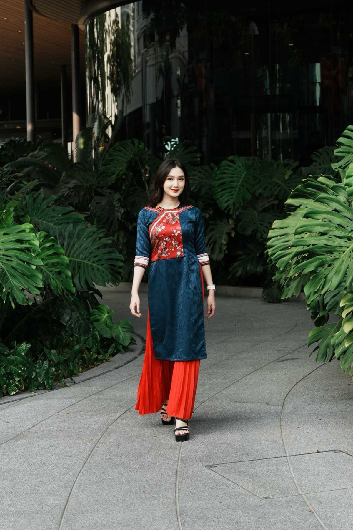 Bold and structural. Deep teal tones meet vibrant red pleats, creating a striking contrast that captures the dramatic spirit of the high-altitude landscape.